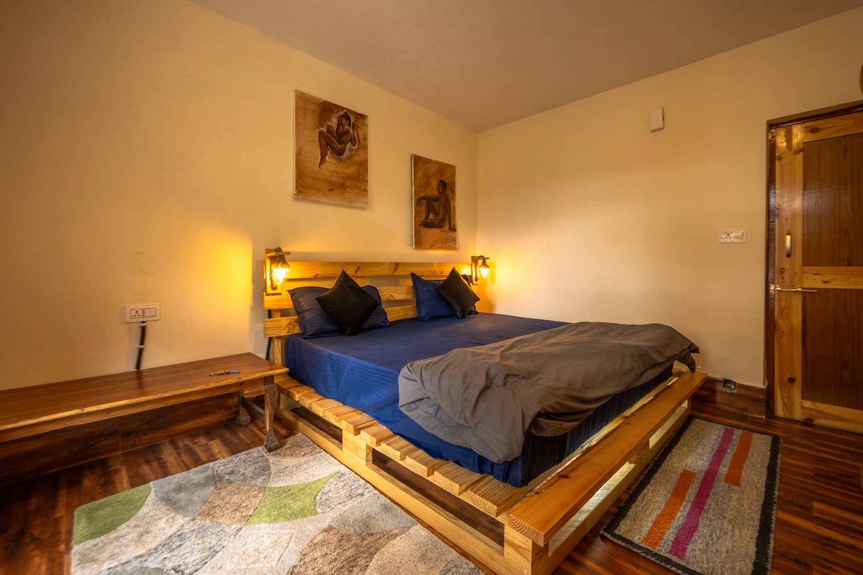 This serene double room at Seri House features a plush double bed, warm wooden textures, and curated art that adds a personal touch. A cozy sit-out by the window opens up to sweeping views of Old Manali’s verdant slopes and snow-dusted peaks, perfect for slow mornings and quiet reflection.