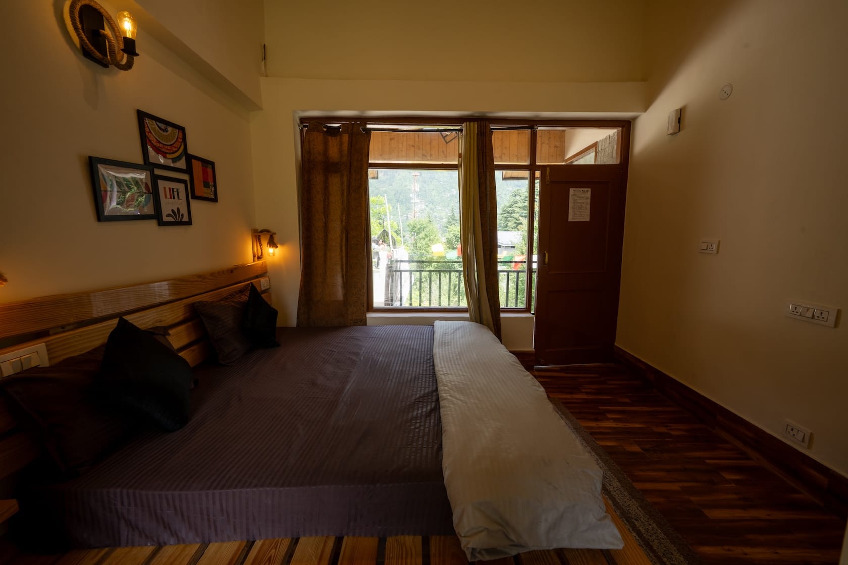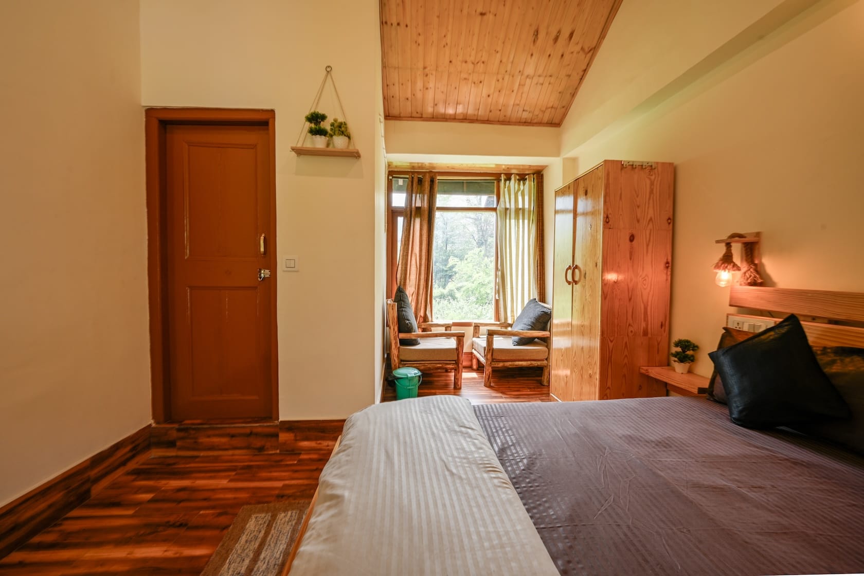 This sunlit corner room at Seri House in Old Manali blends rustic charm with modern minimalism. A handcrafted low-rise wooden bed sits against off-white walls, framed by large windows that open out to lush pine foliage, letting nature pour in. The private balcony, lined with elegant black railings and warm-toned teak flooring, invites slow mornings and mountain air.